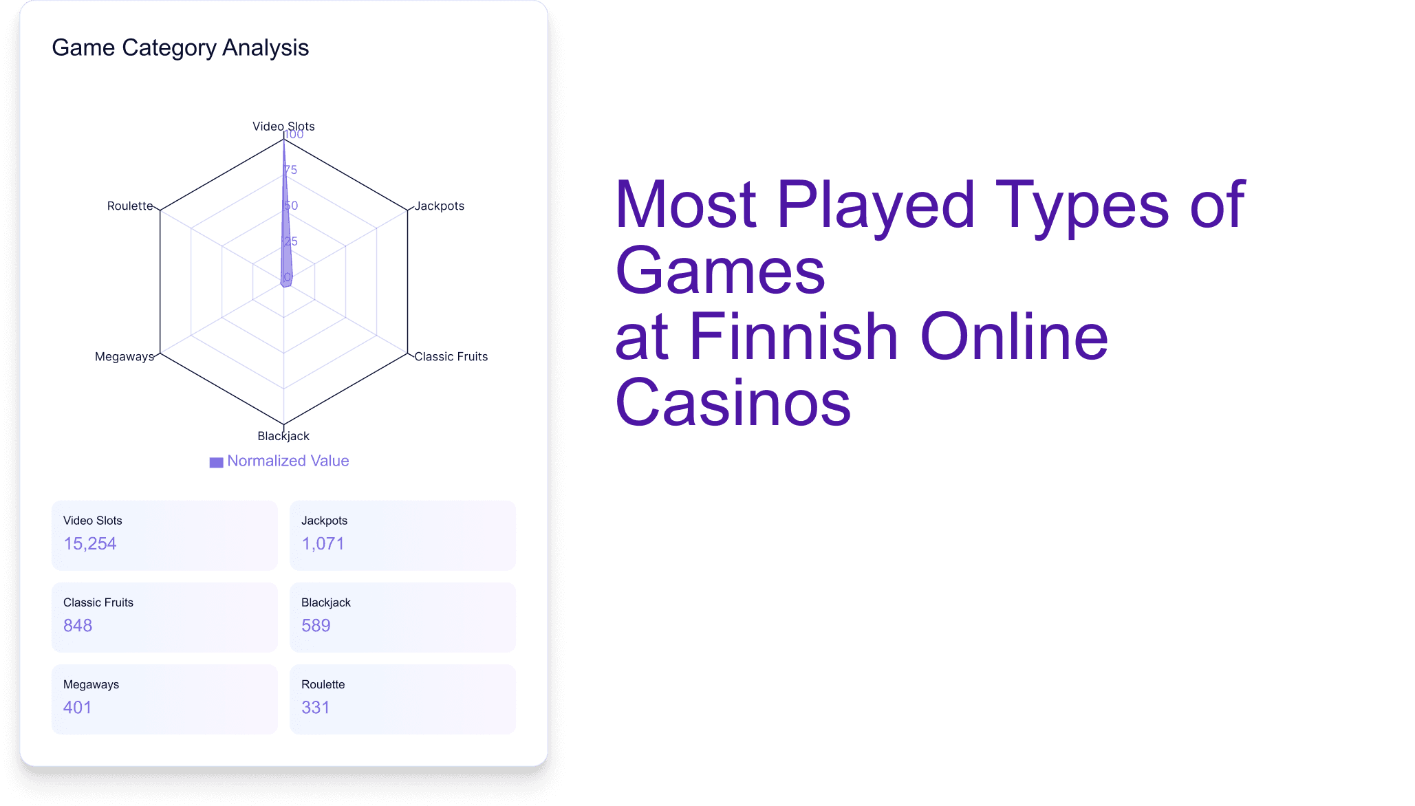 Slot games continue to define Finland's online casino offering. Of the more than 21,000 games available to Finnish players in 2025, approximately 18,913 are slots, accounting for close to 90 percent of all content. Video slots, which are five-reel, feature-rich titles, make up the largest share, followed by jackpot titles and Megaways formats, which, while smaller in number, attract consistent interest.